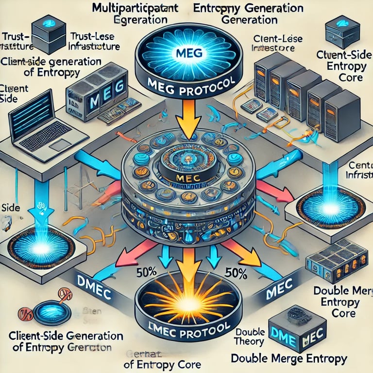 Multiparticipant Entropy Generation protocol, one of the key factors is to have technology that use trust-less infrastructure. In other words, even if we need a central infrastructure (because it is mandatory by quantum physics) we assume that the infrastructures are not trustable. By MEG protocols, the generation of need entropy involve the client side and a DMEC double merge entropy core. The efficiency of MEG protocol is 50% (the maximum possible from Shannon theory perspective).