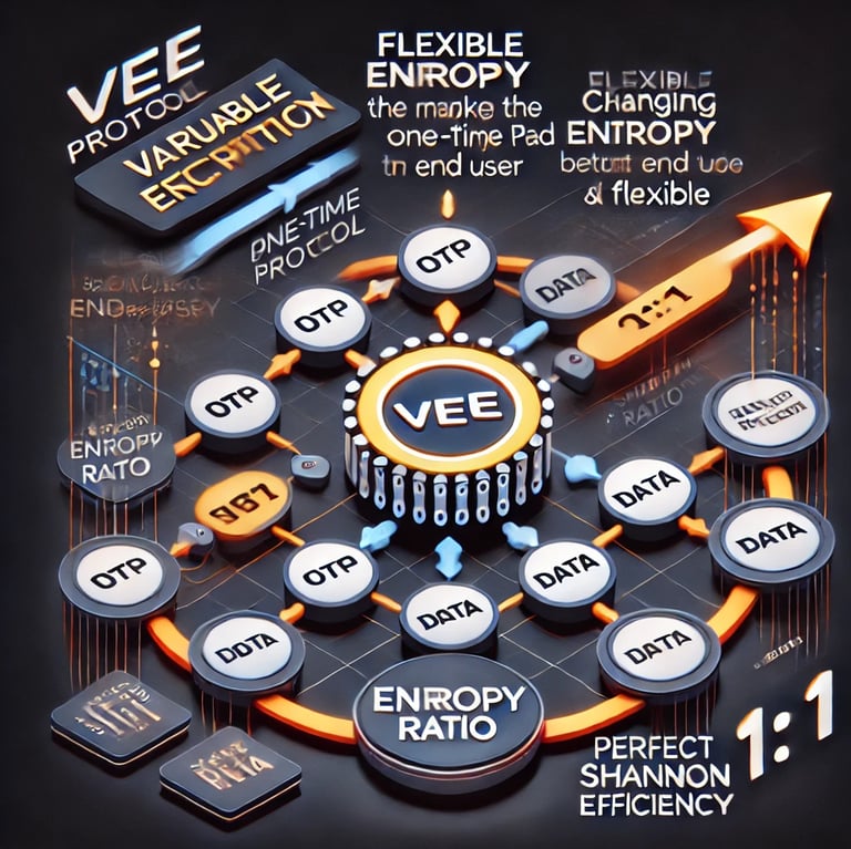 Variable Efficiency Encryption protocols. In order to save as much the amount of entropy the end user need to use, The ratio between the OTP and data must be flexible. The VEE is a protocol the allows to change the amount of entropy in relationship of security level the end user need. The maximum is 1/1 that is perfect Shannon ratio.